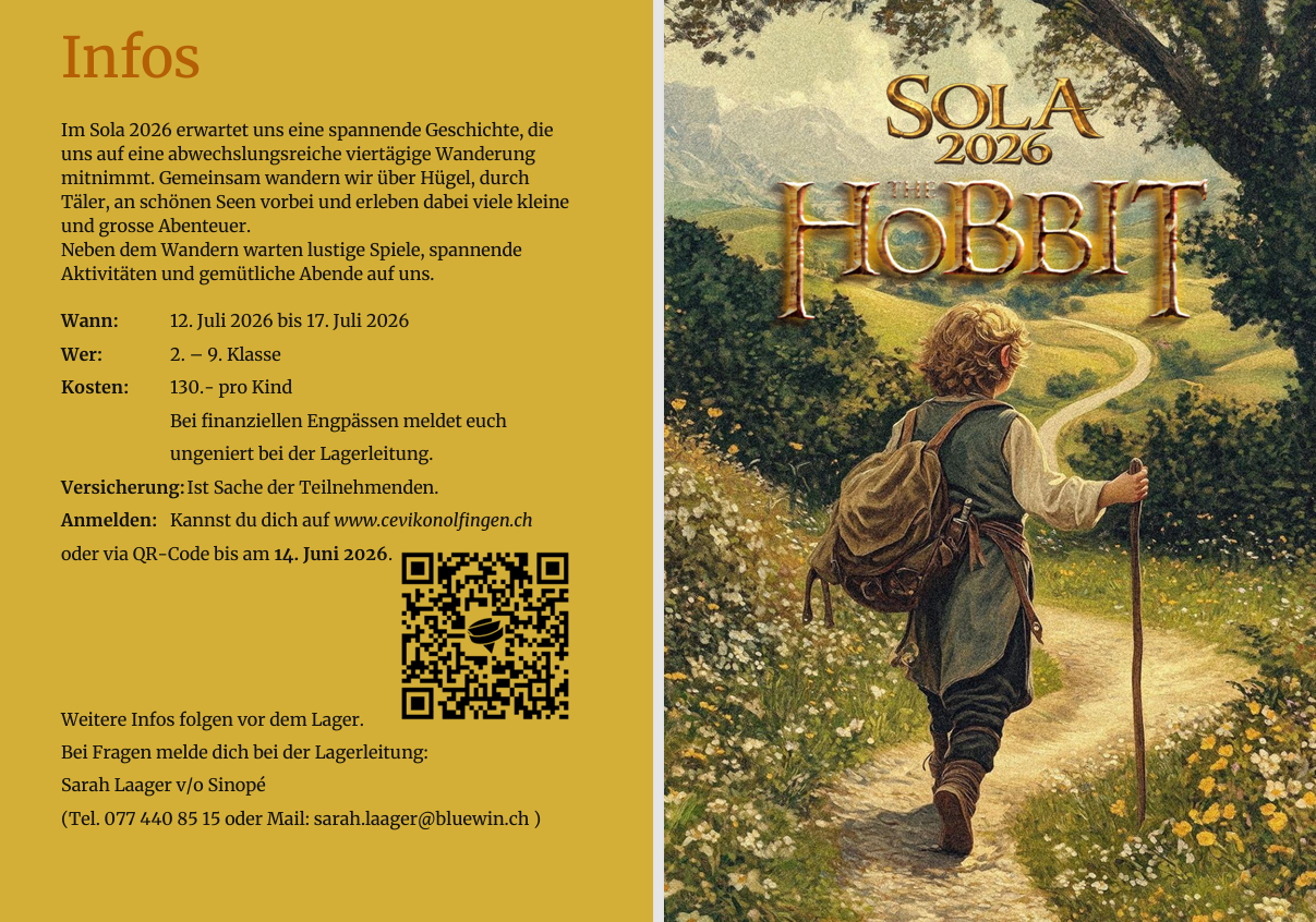 Schon bald ist es soweit - wir gehen ins Sola. Dieses Jahr in einer etwas anderen Form: Wir sind während 4 Tagen zu Fuss zusammen mit den Hobbits unterwegs. Alle wichtigsten Infos entnimmst du dem Flyer.